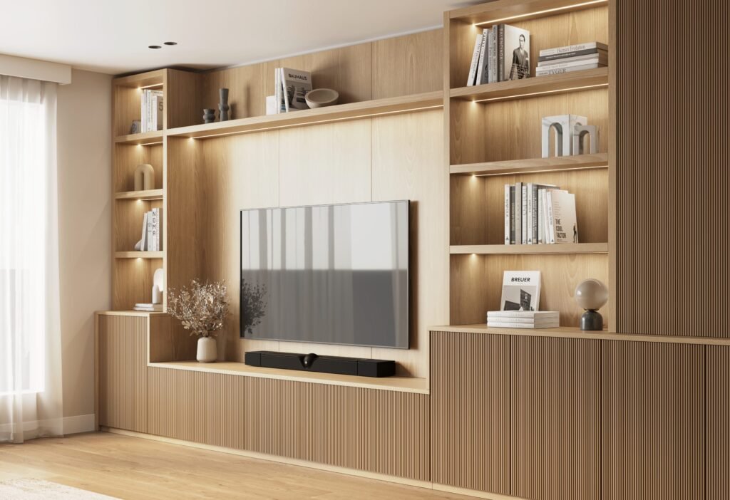Şıklığın ve fonksiyonelliğin buluştuğu TV ünitesi tasarımı dekoratif duvar panelleri ve modern detaylarla fark yaratan uygulama özel ölçü üretim & profesyonel montaj.